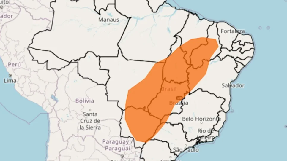 O alerta abrange principalmente a região Centro-Oeste, afetando a maior parte de Mato Grosso e Goiás, além das áreas leste e sul do Mato Grosso do Sul. Na região Nordeste, a situação é crítica na faixa oeste da Bahia, no sul do Maranhão e em grande parte de Pernambuco e Piauí. O estado do Tocantins, na região Norte, também está sob alerta.