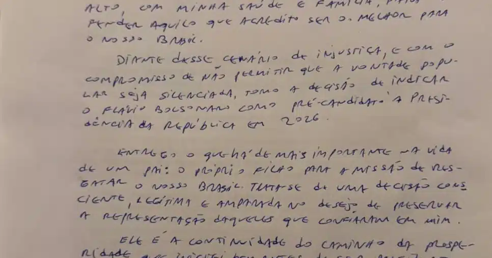 O ex-presidente Jair Bolsonaro confirmou, em uma carta escrita à mão, que seu filho, o senador Flávio Bolsonaro, será seu pré-candidato nas eleições presidenciais de 2026. A leitura da carta ocorreu pouco antes da cirurgia de hérnia inguinal que Jair Bolsonaro irá realizar no Hospital DF Star, em Brasília.