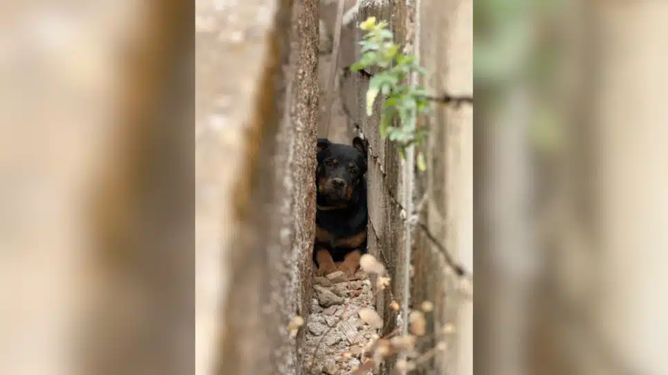 A cadela Atena, da raça Rottweiler, foi resgatada pelo Corpo de Bombeiros de Minas Gerais (CBMG) na última segunda-feira (21). O incidente ocorreu no bairro São Jacinto, em Teófilo Otoni (MG), onde a cadela ficou presa entre dois muros e seu tutor não conseguiu retirá-la.