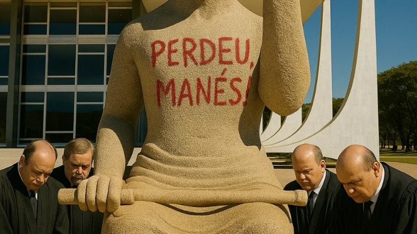 Em sua apresentação, Moraes exibe o polegar levantado e a frase “Perdeu, homem!” pintada no peito da escultura. Ao lado, quatro indivíduos de caráter marginal – parecidos com ministros do Supremo – mantêm a cabeça baixa. A legenda da publicação afirma: “STF VERGONHA INTERNACIONAL” (com erro de digitação na palavra “internacional”).
