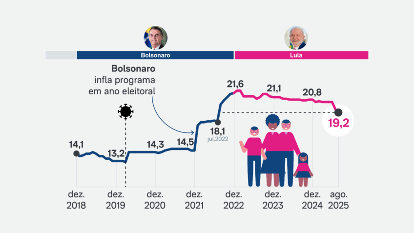 O Bolsa Família registrou uma nova redução em agosto, com 451 mil menos de beneficiários, totalizando 19,2 milhões de famílias. No acumulado do ano de 2025, o maior programa social do país já deixou de atender 1,6 milhão de pessoas.