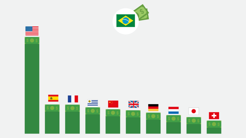 Os Estados Unidos investem quatro vezes mais do que o segundo colocado no ranking do Banco Central. Em 2023, o valor foi de US$ 272,8 bilhões, em comparação com US$ 66,8 bilhões da Espanha. O BC divulgará o levantamento referente a 2024 em 26 de setembro.