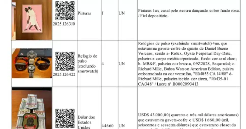 Os agentes da PF identificaram uma pintura de Renoir, cuja autenticidade ainda não foi confirmada. Além disso, foram apreendidos três veículos de luxo: uma Land Rover, uma Trail Blazer e uma BMW X7 M50i na casa de São Paulo, e uma Land Rover blindada na residência em Brasília.