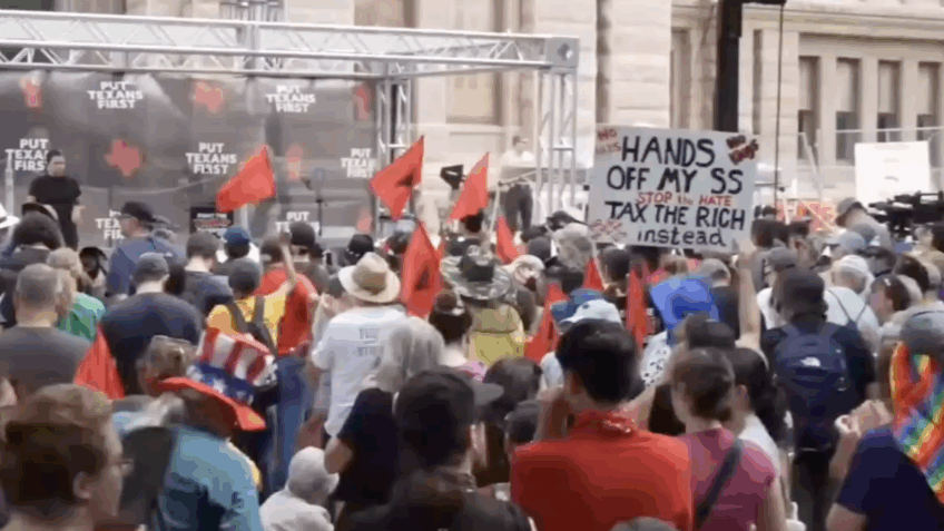 Milhares de manifestantes se reúnem em Austin, Texas, para o evento Fight the Trump Takeover, cantando “SHAME ON ABBOTT”.