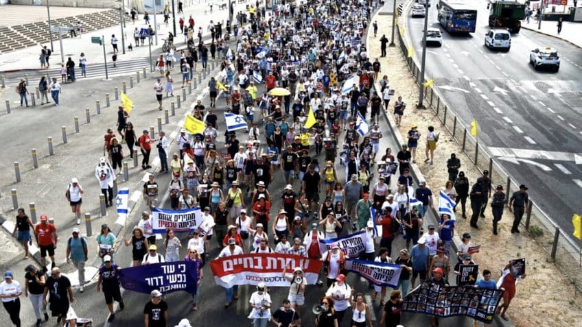Milhares de israelenses realizaram manifestações em várias cidades do país, demandando o término da guerra em Gaza e a libertação dos reféns mantidos pelo Hamas. Os protestos ocorreram no domingo (17 de agosto de 2025), organizados por grupos que representam familiares dos sequestrados.