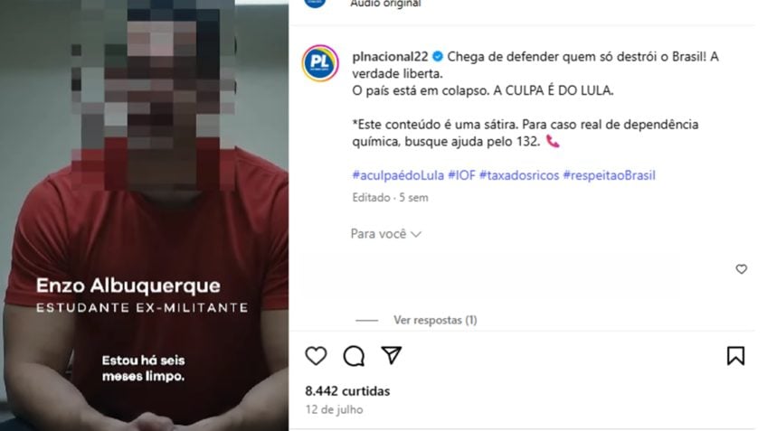 A campanha política também vincula o PT à corrupção, ao aumento de impostos e ao “roubo das aposentadorias dos idosos”. “Fim de defender quem destrói o Brasil! A verdade liberta. O país está em colapso. A responsabilidade é do Lula.” *Este conteúdo é uma sátira. Em caso de dependência química, procure ajuda pelo 132*, diz a legenda do vídeo.