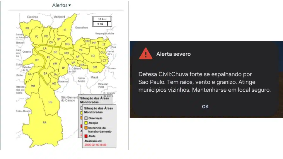 A Defesa Civil do estado emitiu um alerta severo para chuvas intensas e raios na Grande São Paulo nesta segunda-feira (16). Além das chuvas, a região pode enfrentar ventos fortes e granizo.