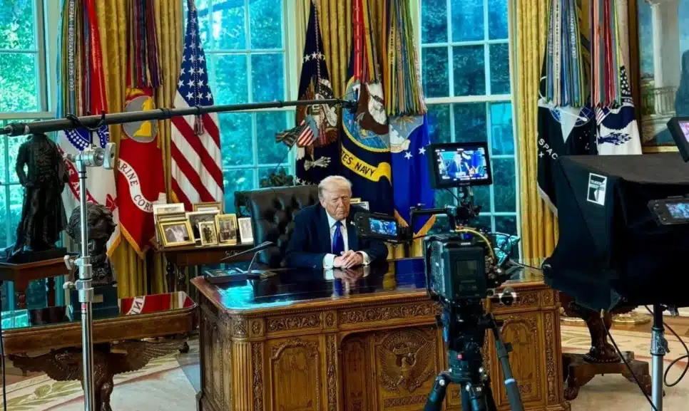 Na legenda da foto, Karoline Leavitt destacou: “Nos bastidores do Salão Oval: o presidente Trump responde ao aceite do seu plano de paz pelo Hamas. Fique ligado!” A imagem mostra Trump com equipamentos de gravação e um teleprompter à sua frente.