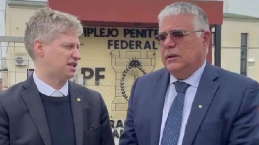 O deputado federal Marcel van Hattem (Novo-RS) e o senador Eduardo Girão (Novo-CE) visitaram o complexo penitenciário de Ezeiza, em Buenos Aires, para conhecer os cinco brasileiros detidos em razão dos eventos de 8 de janeiro de 2023.