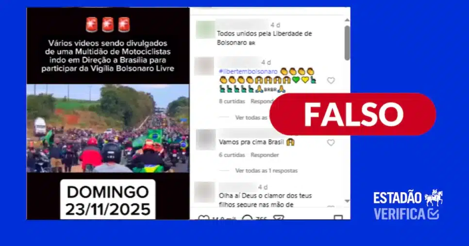 Um vídeo que circula nas redes sociais mostra uma multidão de motociclistas se dirigindo a Brasília para participar da vigília “Bolsonaro livre”. No entanto, a verificação realizada pelo Estadão Verifica revelou que o conteúdo é falso.
