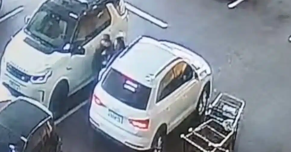 As imagens mostram a vítima se aproximando de um carro SUV branco, quando um homem, também vestido de branco, a aborda. O sequestrador a força a entrar no veículo, enquanto algumas pessoas tentam intervir, correndo em direção ao carro.