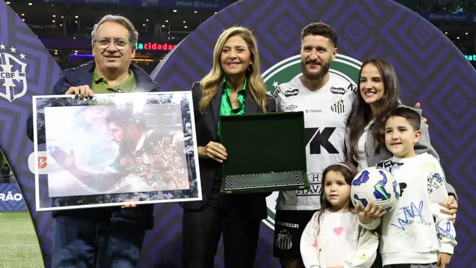 O jogador Zé Rafael, atualmente no Santos, recebeu uma homenagem da presidente do Palmeiras, Leila Pereira, antes da partida contra o Peixe, válida pelo Campeonato Brasileiro, na última quinta-feira (6).